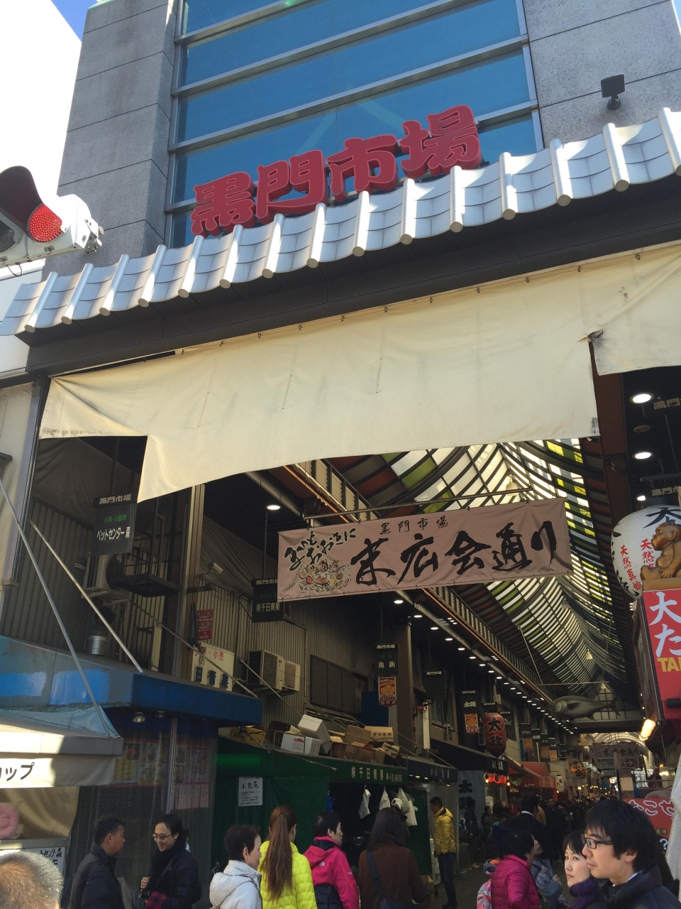 大阪市営地下鉄日本橋駅から堺筋を少し南下したところにゲートがある、以前は大阪市民の台所、今は海外からの観光客の食べ歩きエリアになってしまった市場です。アーケードになっていて、天井からはカニなどのオブジェがつるされています。