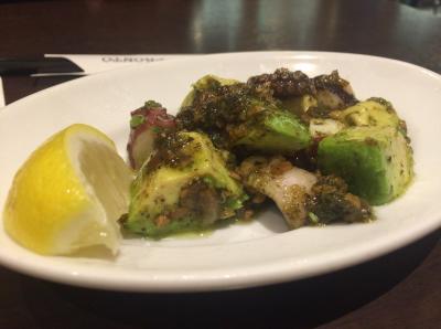 プレミアムモルツも香るエール@580円をいただくのですが、つまみとセットにすると、つまみが割引になるということのようです。で、タコとアボガドのサラダをセットにしていただきました。