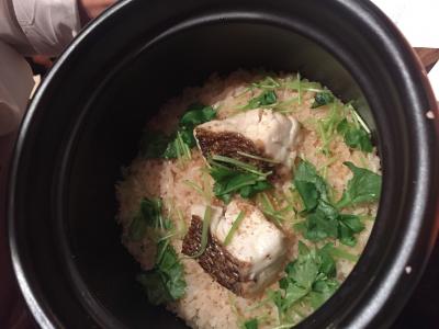 宴の〆は「鯛飯」です。こちらはお値段からすると、小さめの鯛が丸ごと一尾と勘違いしていました…でも、2切れで鯛飯とはいかがなものでしょうか。