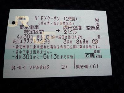 成田空港発着となる海外・国内旅行商品(いずれも航空券のみを含む)を購入した場合に、成田エクスプレス号の指定席をお得に利用できるきっぷです。往復利用だけでなく、グループの片道利用も可能です。私は大人2枚用4,800円を購入し、渋谷~成田空港までの片道を2人で利用しました。