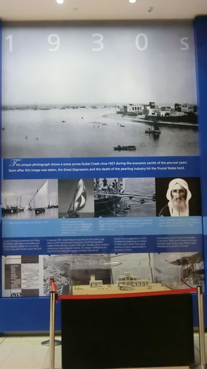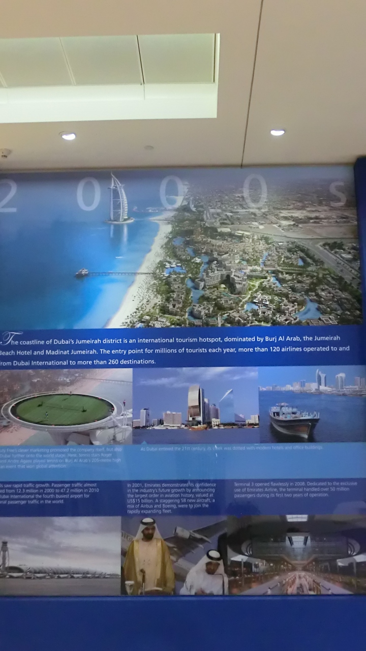ドバイ国際空港は1960年に開港しました。それから2008年ターミナル3開業までの空港発展の経緯が写真とパネル、開港時の模型で説明されています。