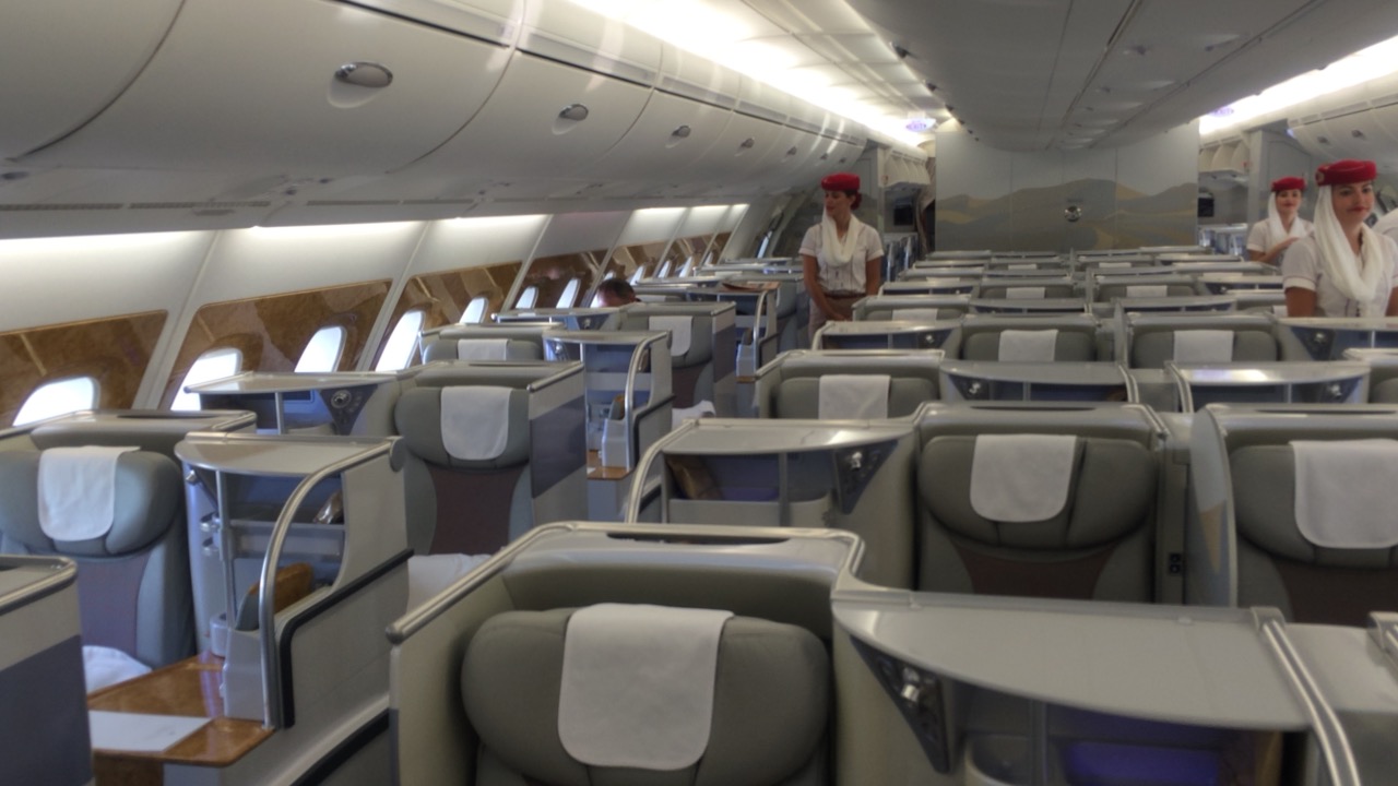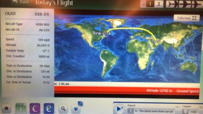 ドバイ−ニューヨーク便はエミレーツの主力路線の一つなので4便/日(内1便はミラノ経由)飛ばしています。A380のビジネスクラスはシート配置変形の1-2-1です。