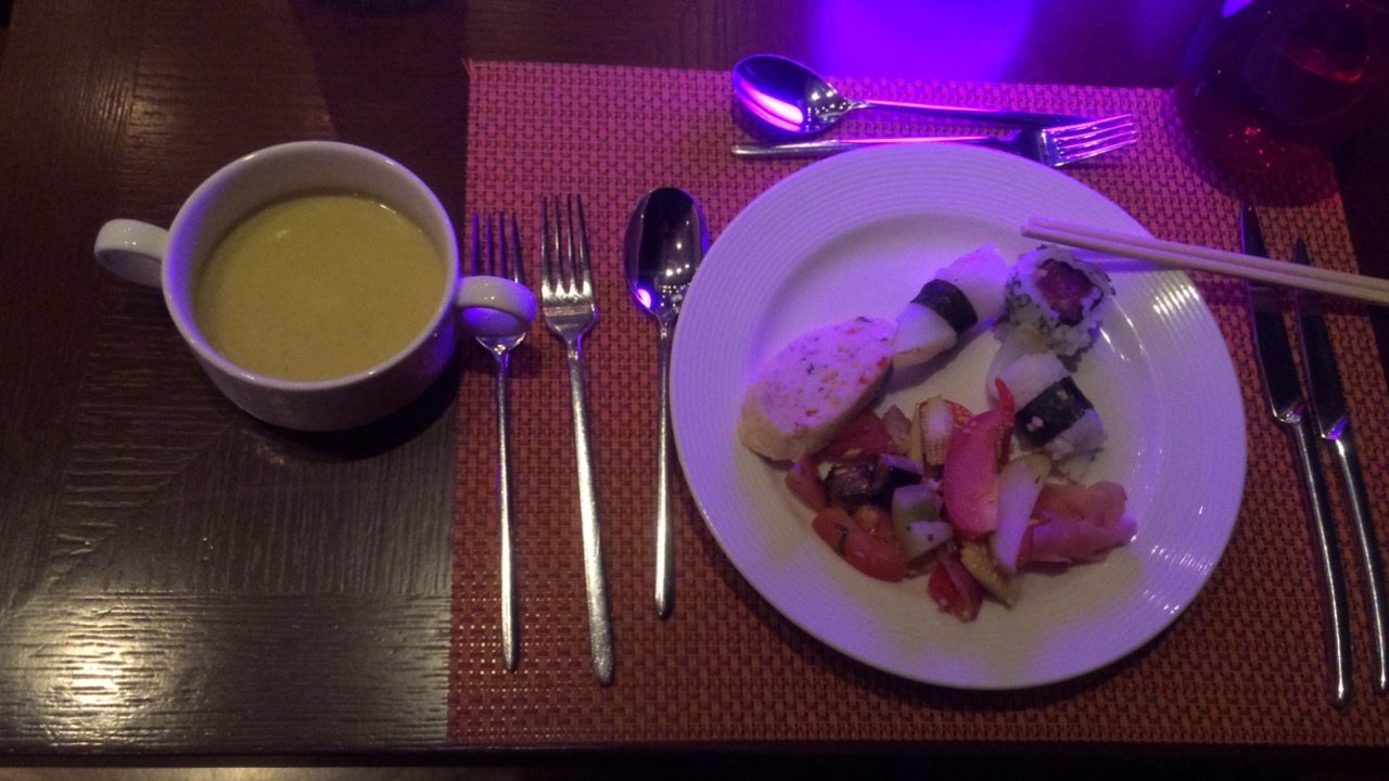 軽食はサンドイッチ、寿司が中心です(内容は定期的に変わります)。スープも定期的に変わり、運がよいとカボチャのスープをいただける場合があります。