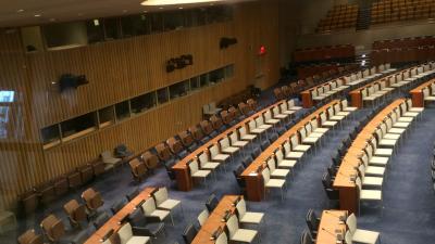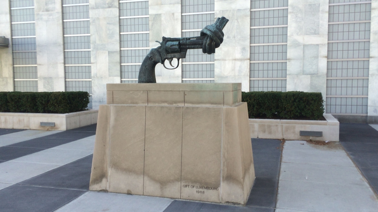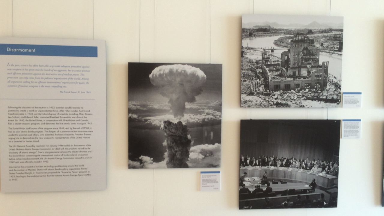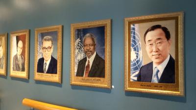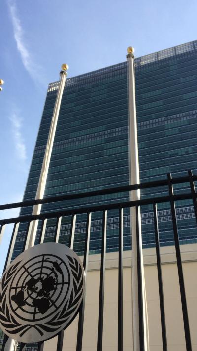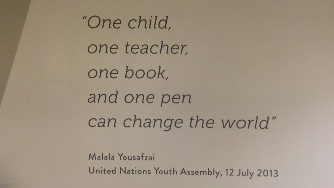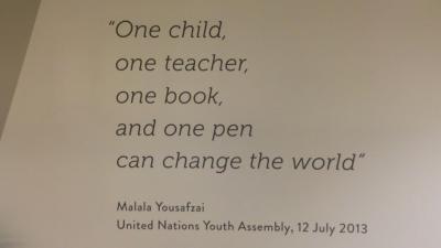 ビジターセンター内では国連70年の歴史がパネル展示されています。地階のショップでは国連マークのポロシャツがなかなか良いです。図書コーナー(本屋さん)の壁にはマララさんのノーベル平和賞受賞時のスピーチでの有名な言葉が刻まれています。- 旅行時期