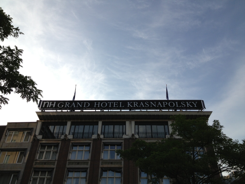 NH グランド クラスナポルスキ ”NH Grand Hotel Krasnapolsky”はダム広場に面しています。アムステルダム中央駅からも徒歩10分弱なので、重いスーツケースをコロコロしながらでも大丈夫です(ただし、歩道は石畳なのでキャスターに負担が掛かりますけど)。創業はAdolph Wilhelm Krasnapolsky氏により1865年となっています。ホテルロビーにご夫妻の写真が飾られています。またロビー階のラウンジ(カフェ)は”Mathilda Grand Cafe”と奥方の名前が冠されています。