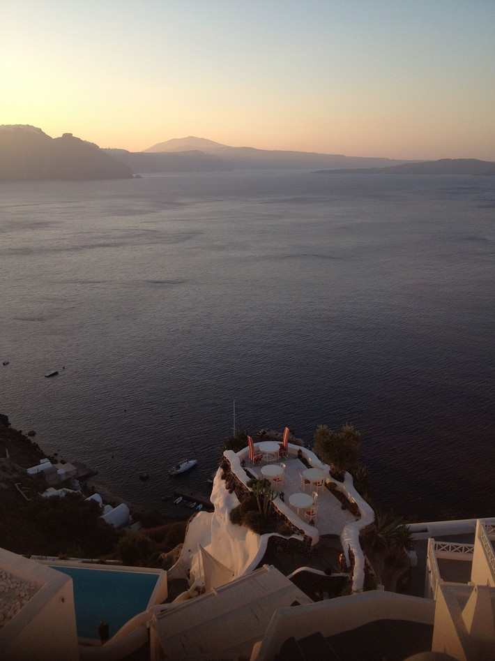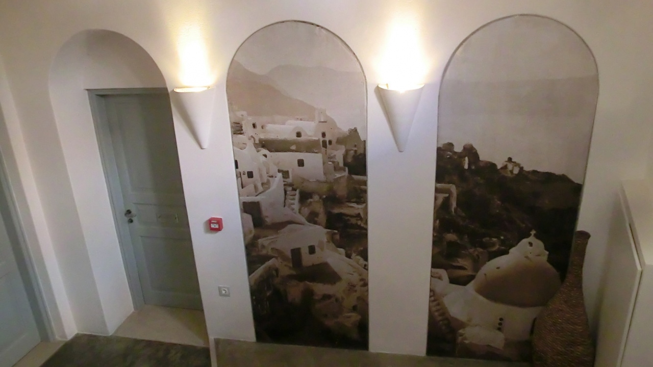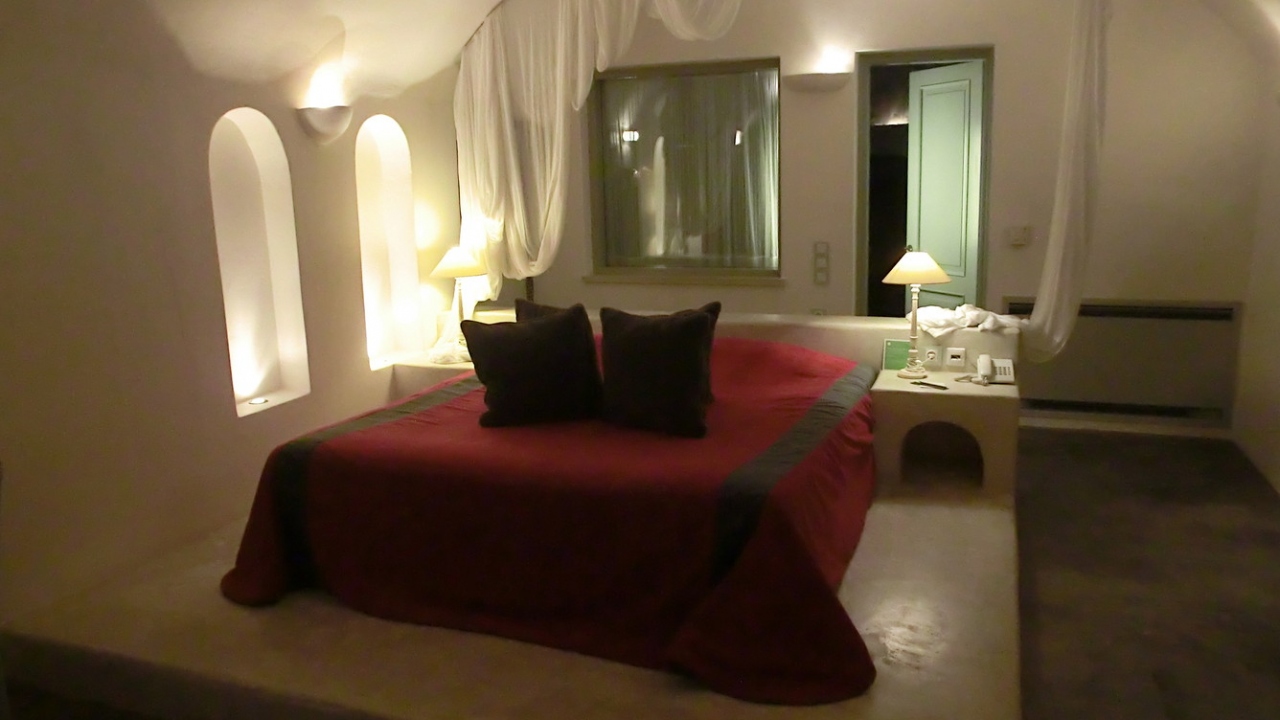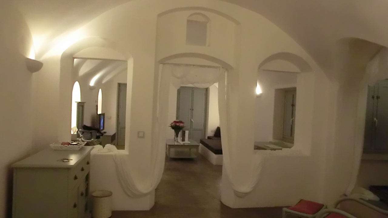 このホテルは"世界一夕日が美しい"イア(Oia)に在ります。宿泊した"Deluxe Suite with Indoor Jacuzzi"は62平米と広く、また室内に洞窟の形に作られたジャグジーが特長です。