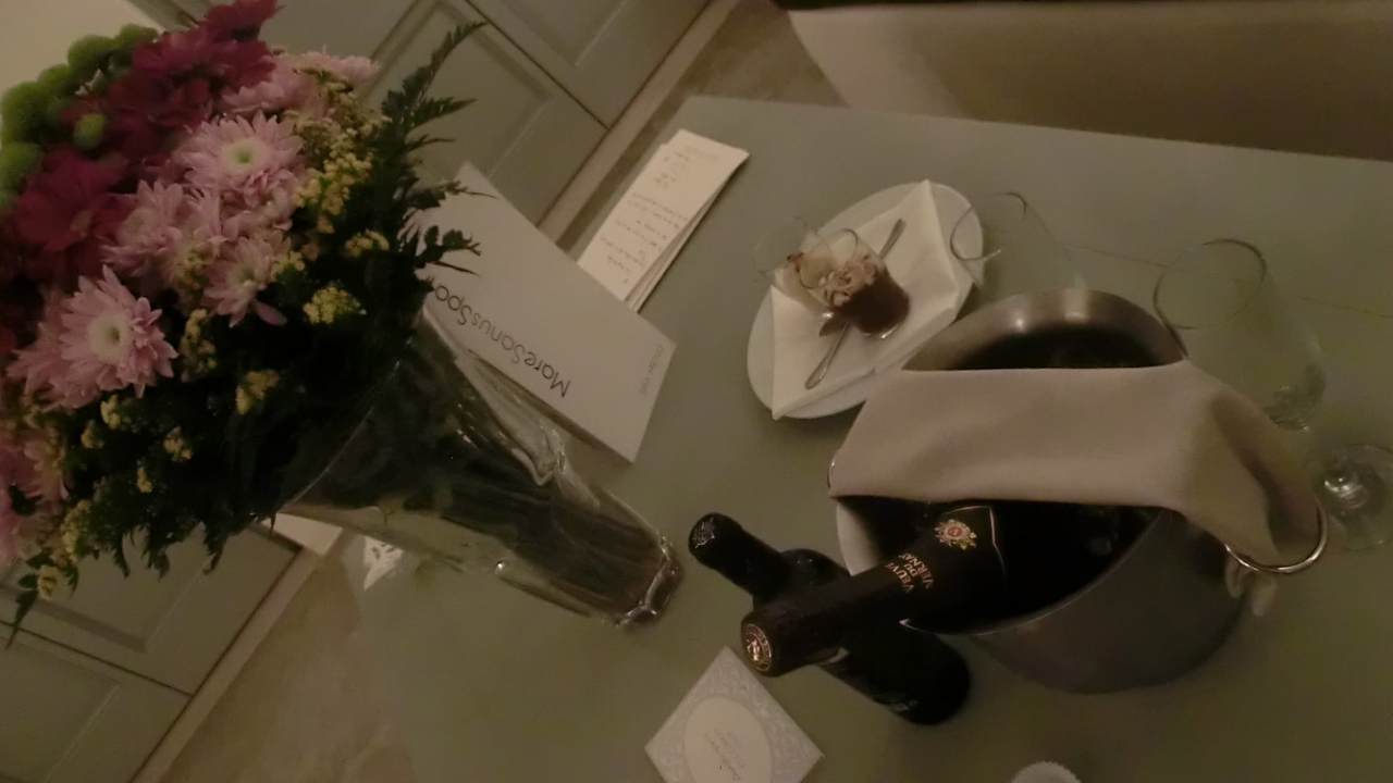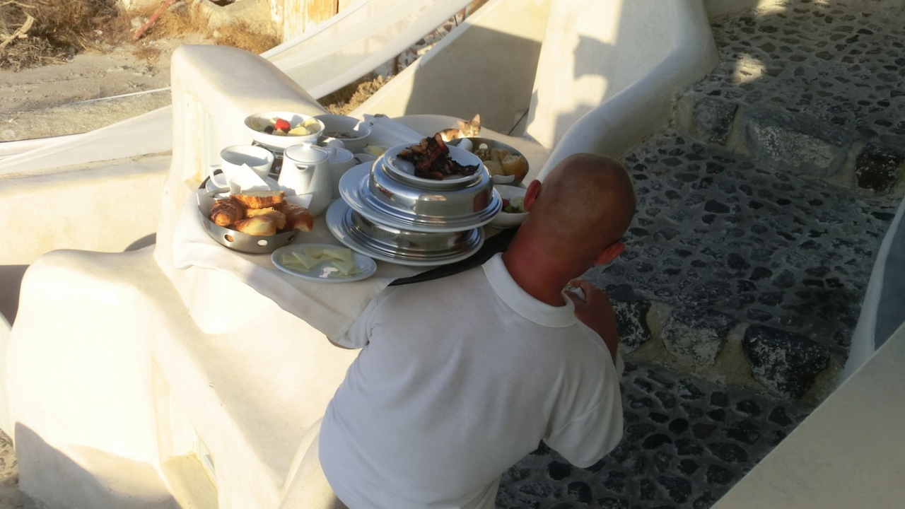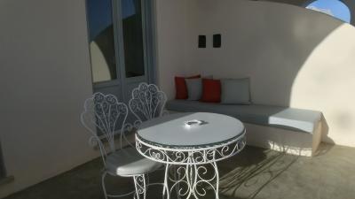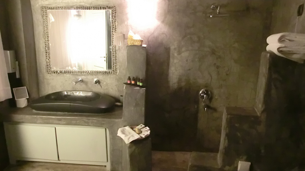 このホテルは"世界一夕日が美しい"イア(Oia)に在ります。宿泊した"Deluxe Suite with Indoor Jacuzzi"は62平米と広く、また室内に洞窟の形に作られたジャグジーが特長です。