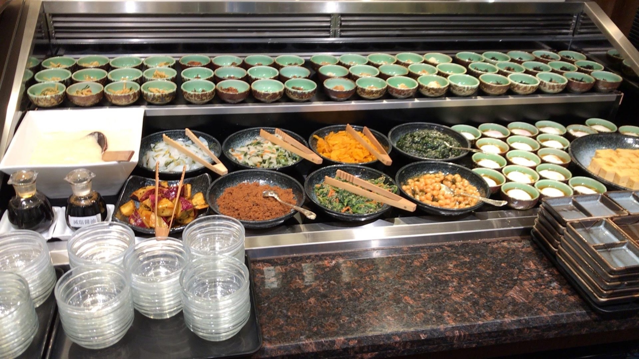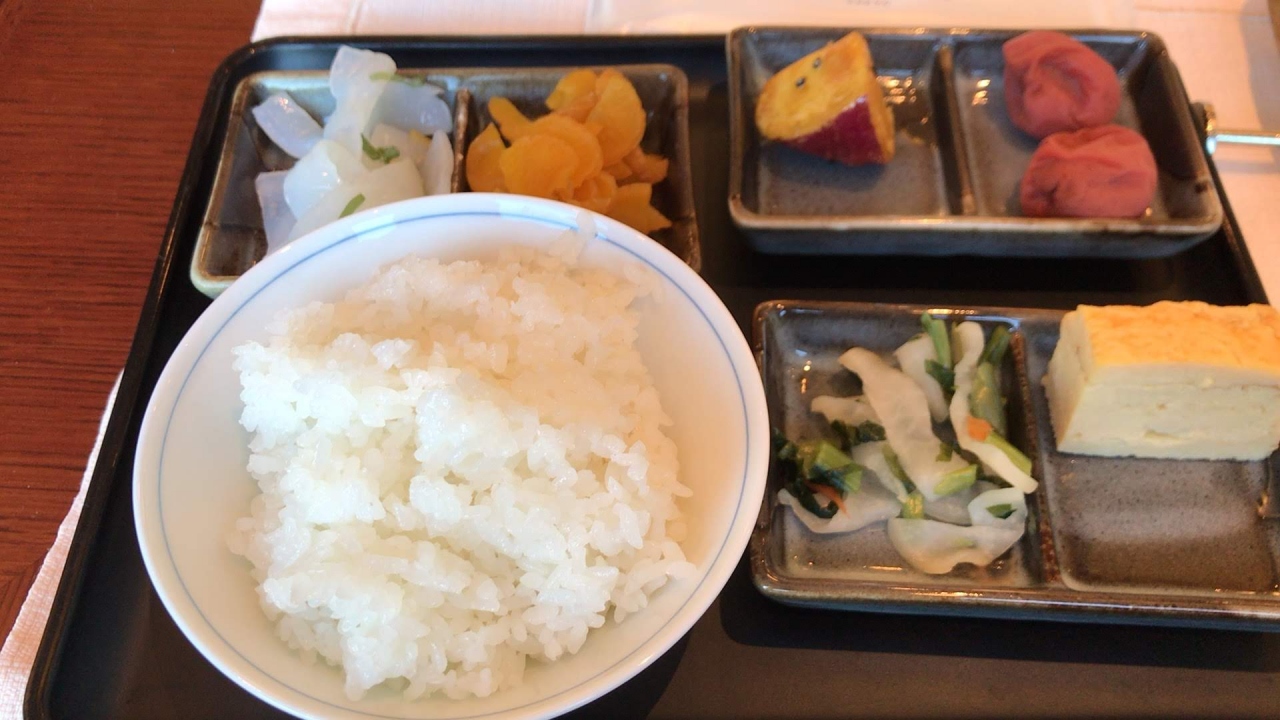 和食コーナーの梅干し(たぶん紀州南高梅)が酸っぱすぎない美味しさで"ご飯が進むくん"です。