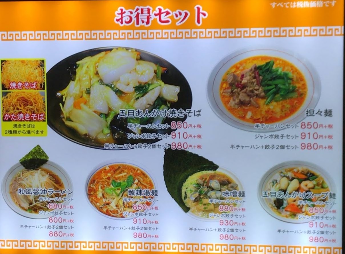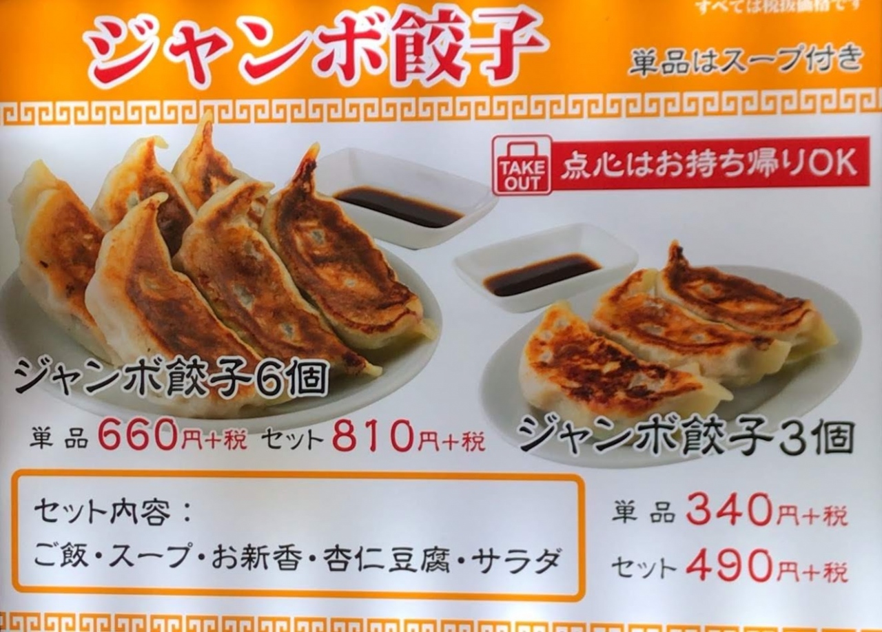 餃子はスーパーで売っている安い餃子ようなモソモソした食感で看板の「普通の餃子3個分! 肉汁たっぷり! 」には遠く及ばず。