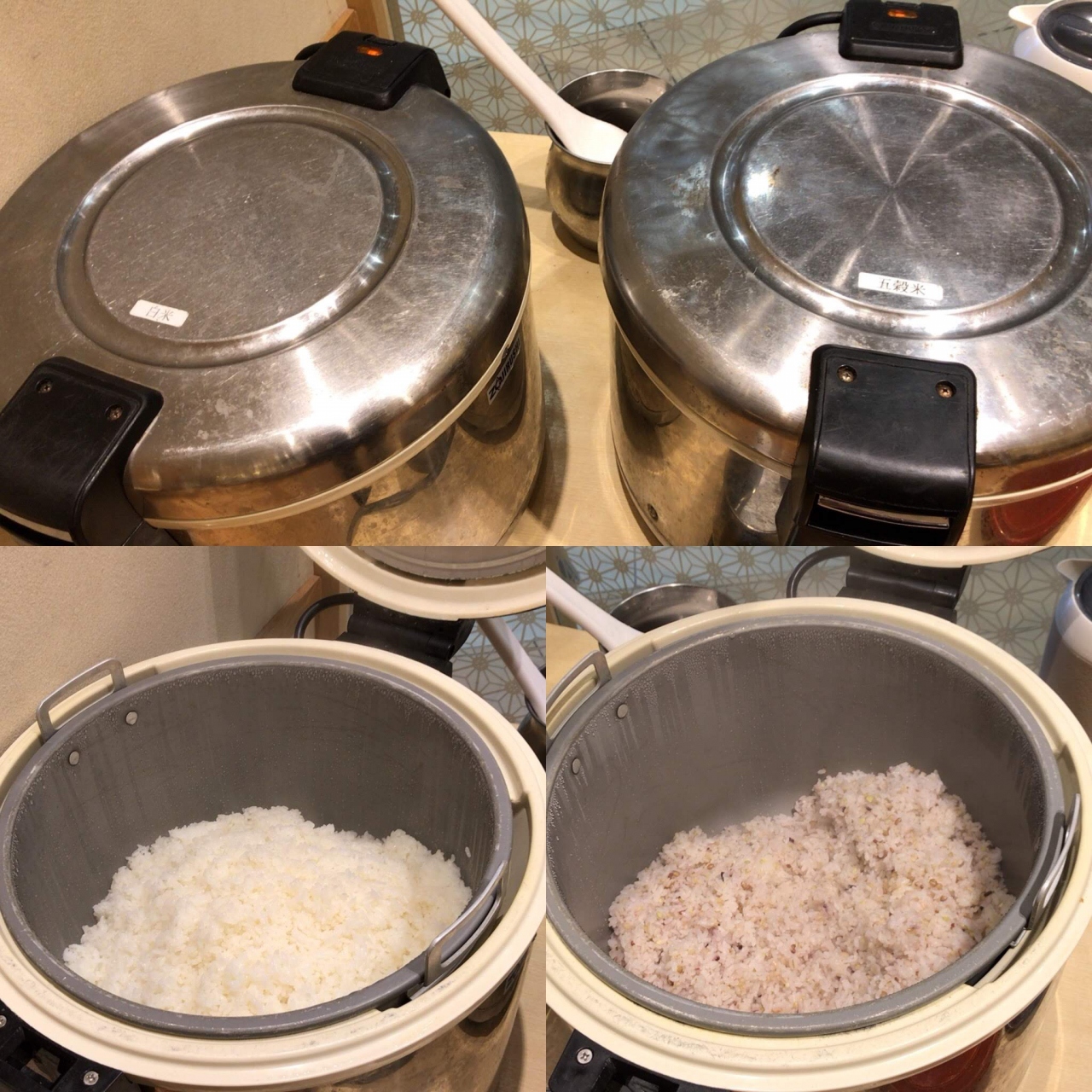 ご飯(白米、十五穀米)、味噌汁がお替り自由。辛子明太子は食べ放題です。