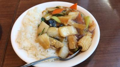 五目かけご飯、海鮮お粥、鶏肉の味噌炒め、ジャージャー麺(冷)を二人でいただきました。