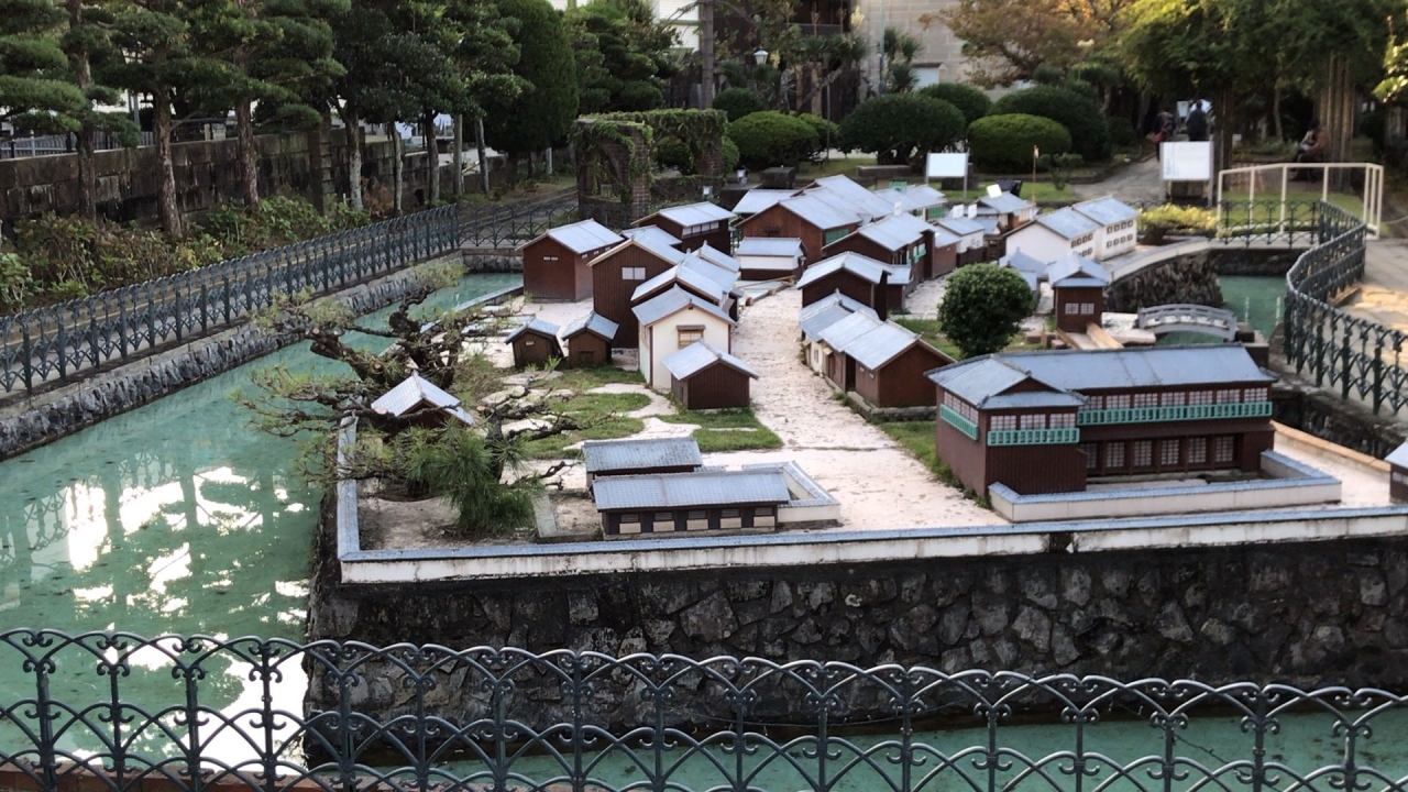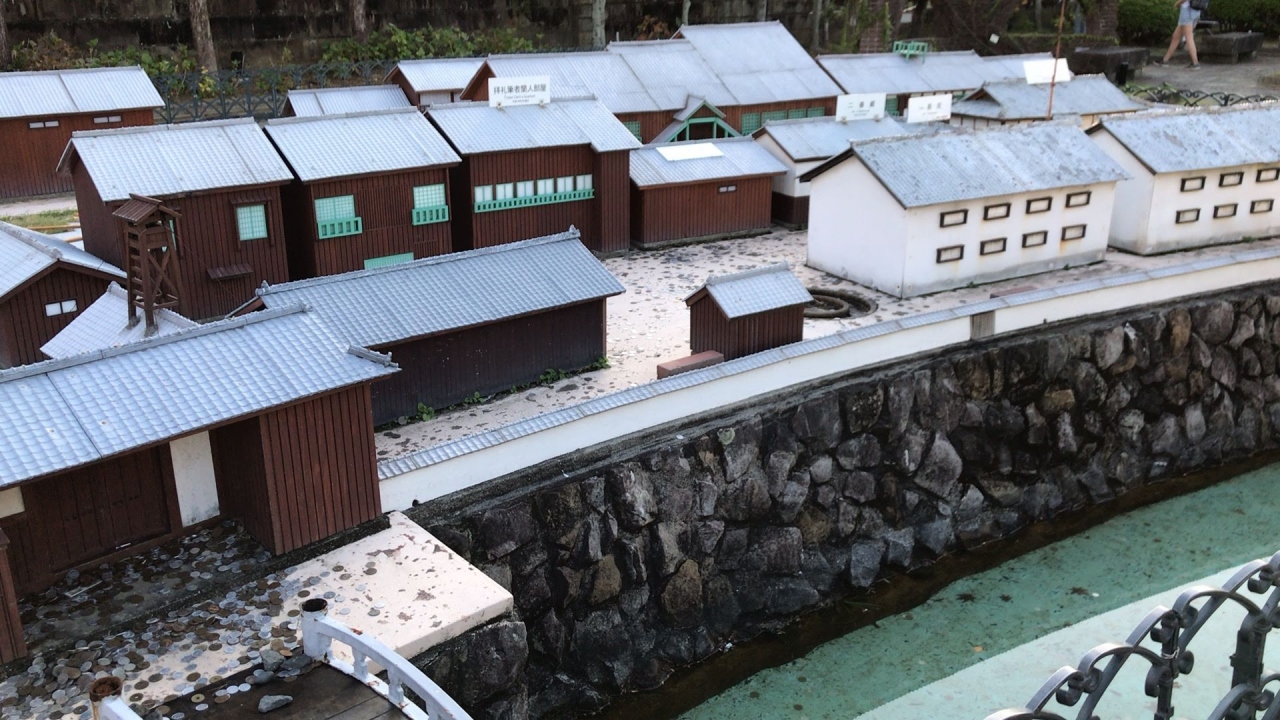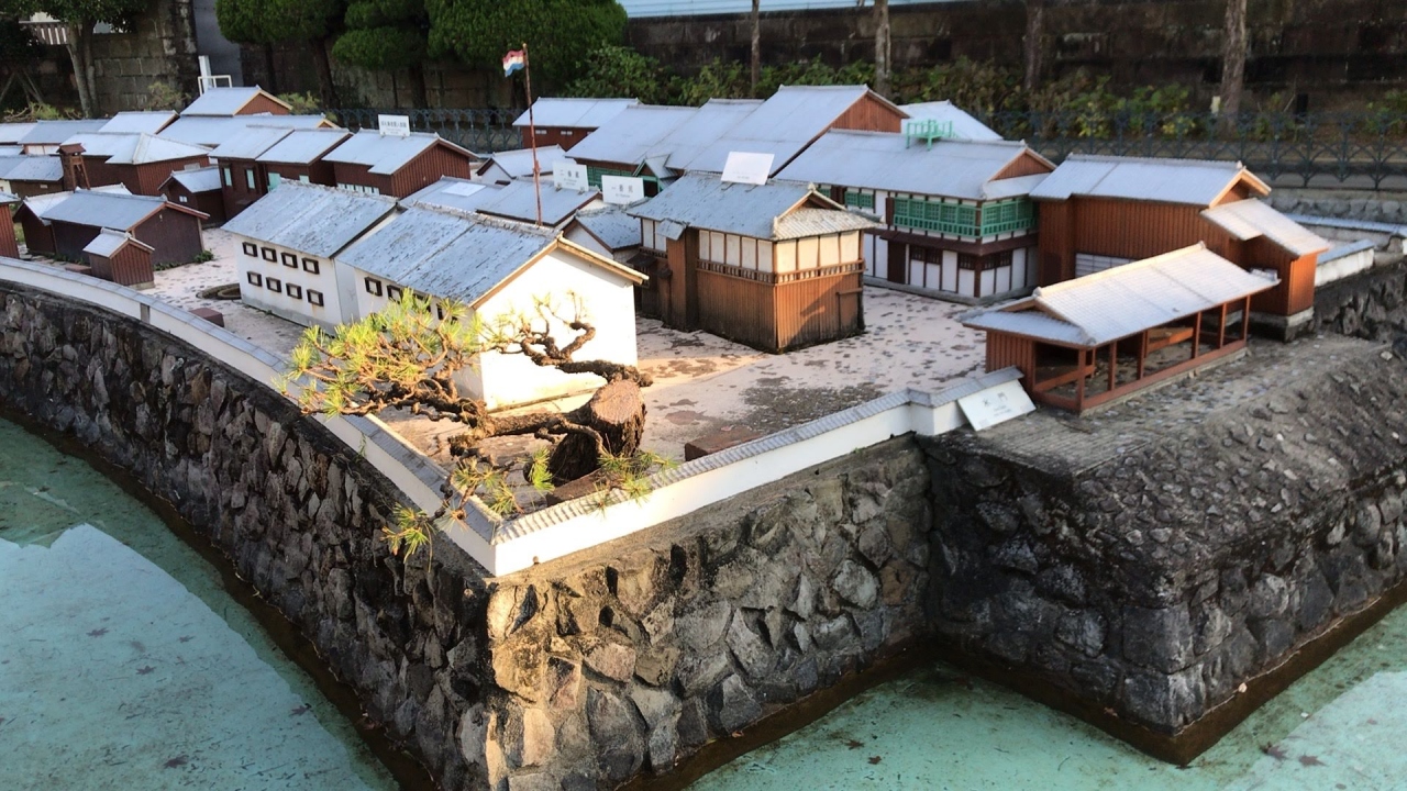 出島の背景のビルが映ってしまう。ミニチュア出島で出島全体像がわかる。