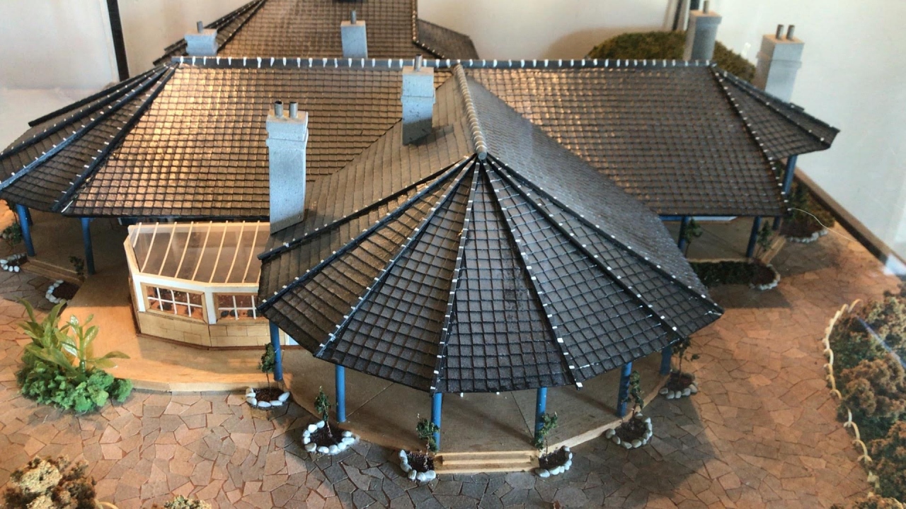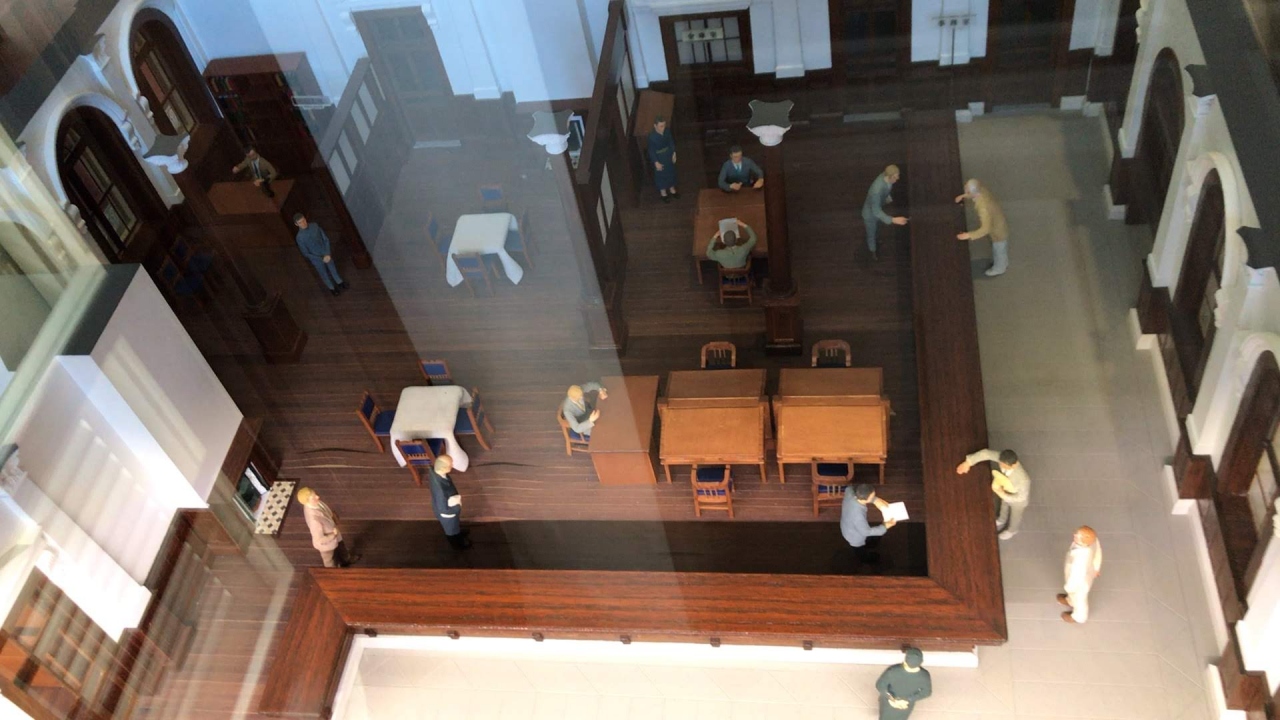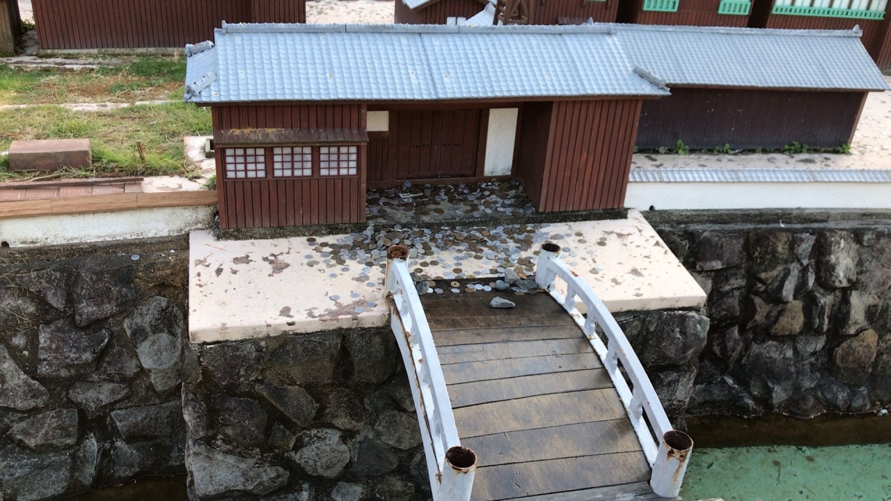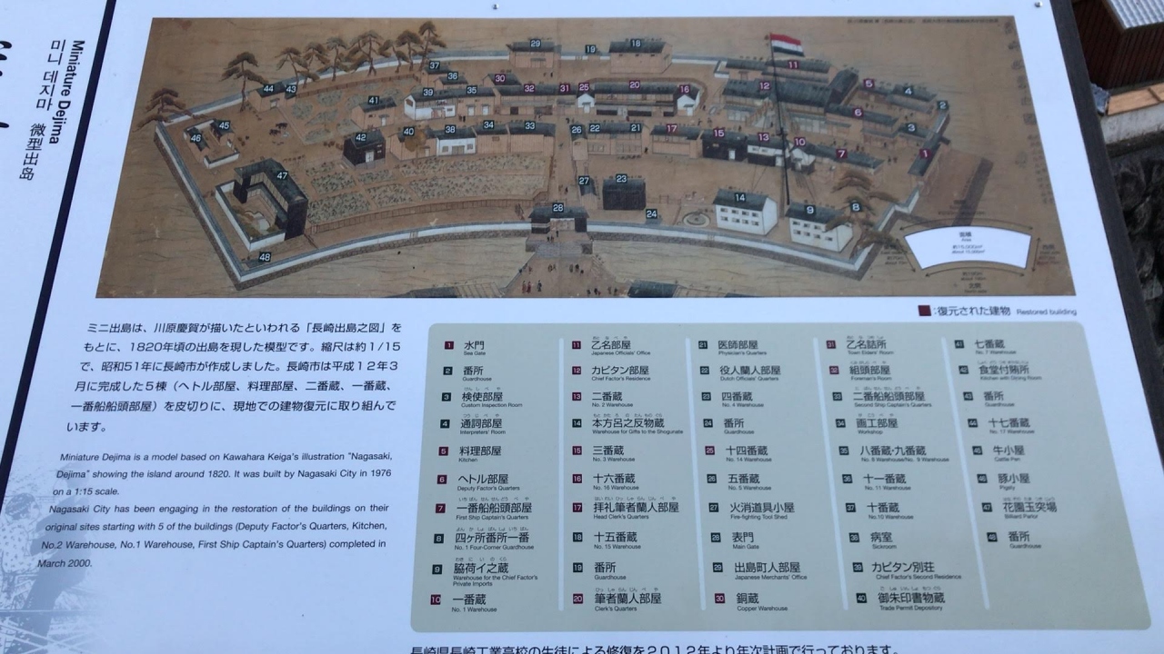 出島の背景のビルが映ってしまう。ミニチュア出島で出島全体像がわかる。