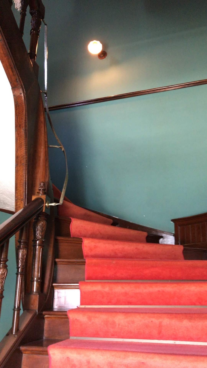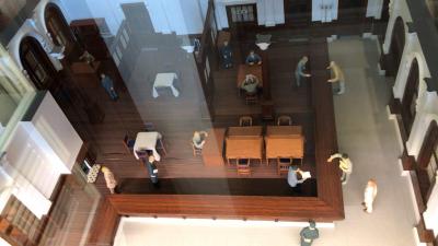 一階は大きく長いカウンターが特徴の昔の銀行です(一階は無料)。