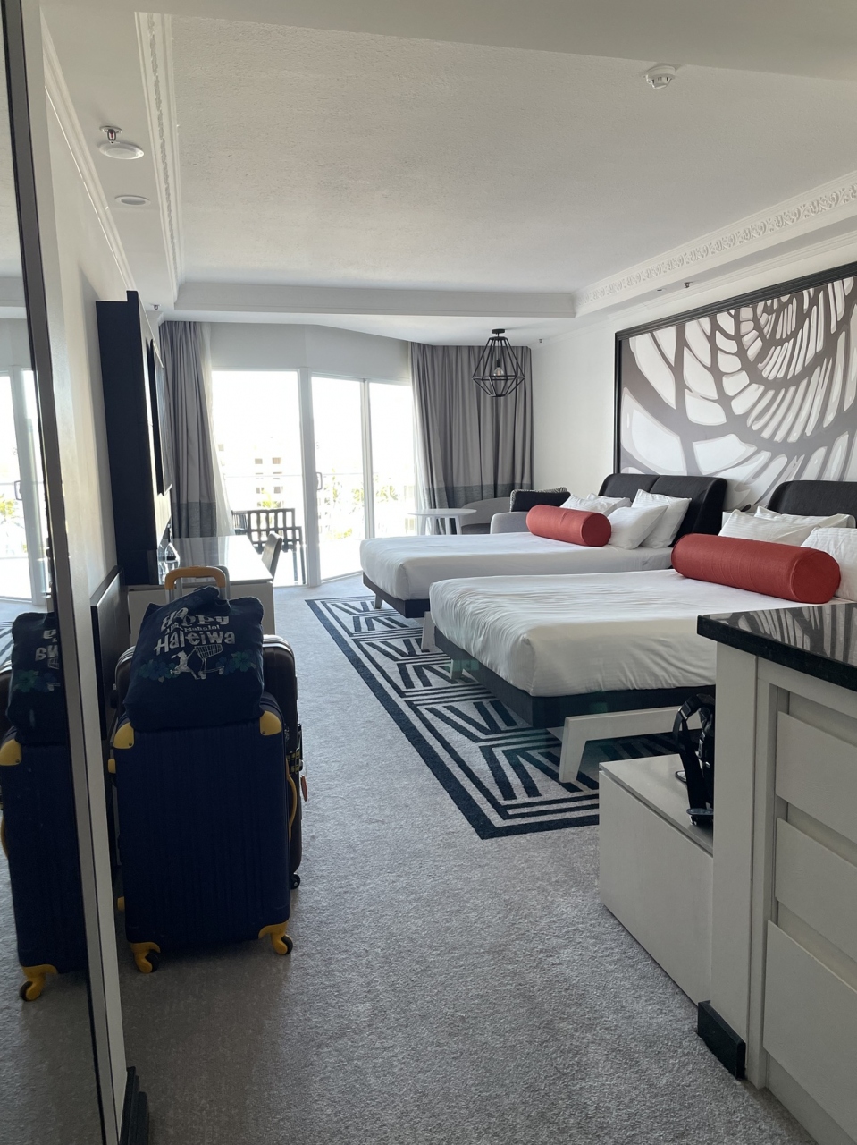 クイーンベッド2台のお部屋はとっても広く、スーツケース台も2箇所、コンセントも多く、スマホ3台にカメラの充電などもストレスなくできました。