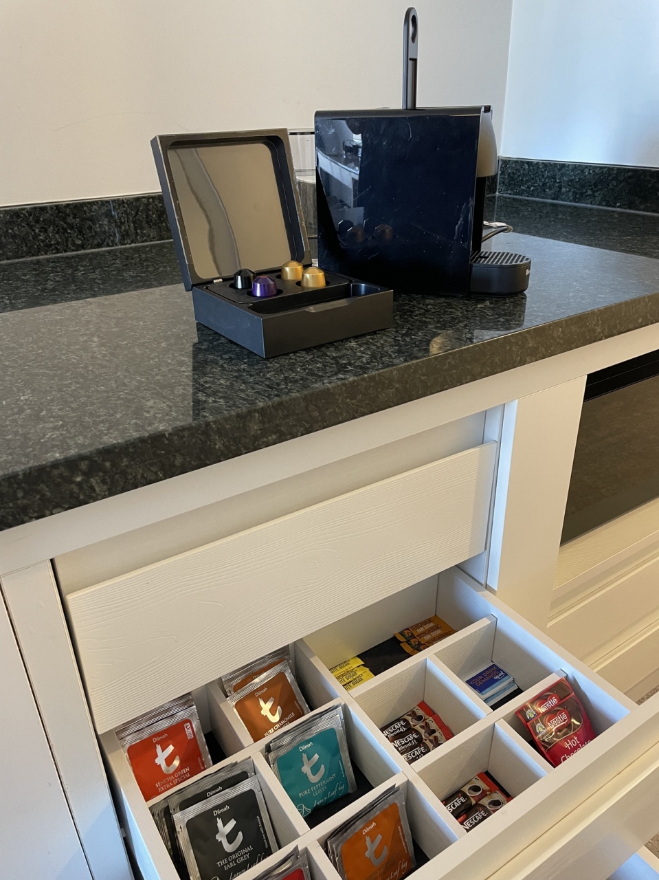 ネスプレッソやレンジもあり、テーブルとソファで軽めの食事もでき、お部屋でくつろぐにもとっても便利でした。