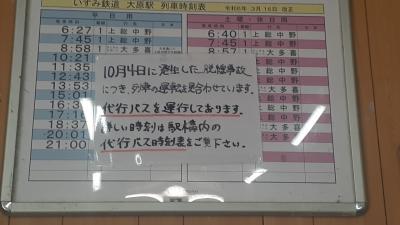 その代わりに列車代行バスが運行され、そのバスで移動するかたちになりますが、平日こそ大原~大多喜間で1日あたり23便、大多喜~上総中野間で13便あり、大原発の最終も20時20分、大多喜発の最終も19時30分と利便性はそれなりに保たれています。しかし土日祝日の場合、大原~大多喜間で1日あたり13便、大多喜~上総中野間で8便と運行本数が概ね半減し、しかも大原発の最終が17時20分、大多喜発の最終が17時10分と非常に早く、不便です。