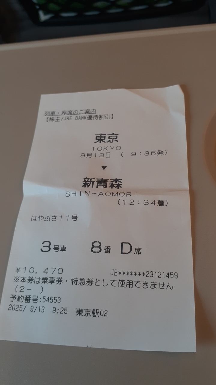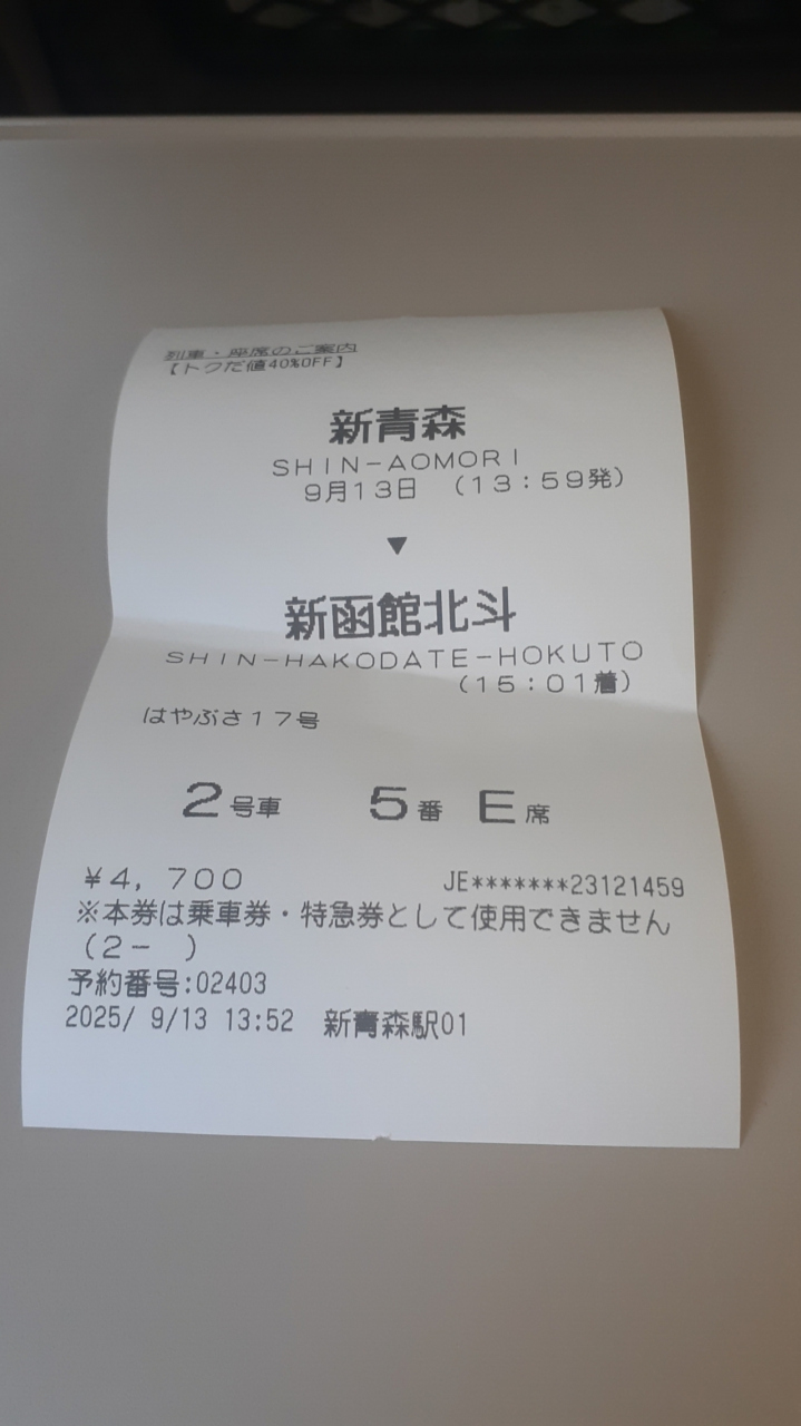 2025年9月13日に新青森13時59分発はやぶさ17号新函館北斗行きで新青森から新函館北斗まで移動しました。