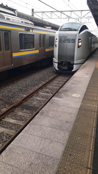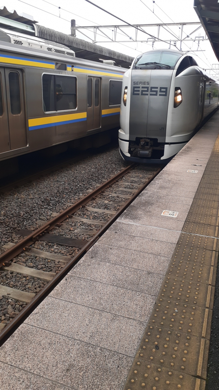 少し前までは255系という9両編成の特急車両が使用されていましたが、2025年10月20日現在、特急成田エクスプレスにも使用されているE259系という特急車両に変わっていました。