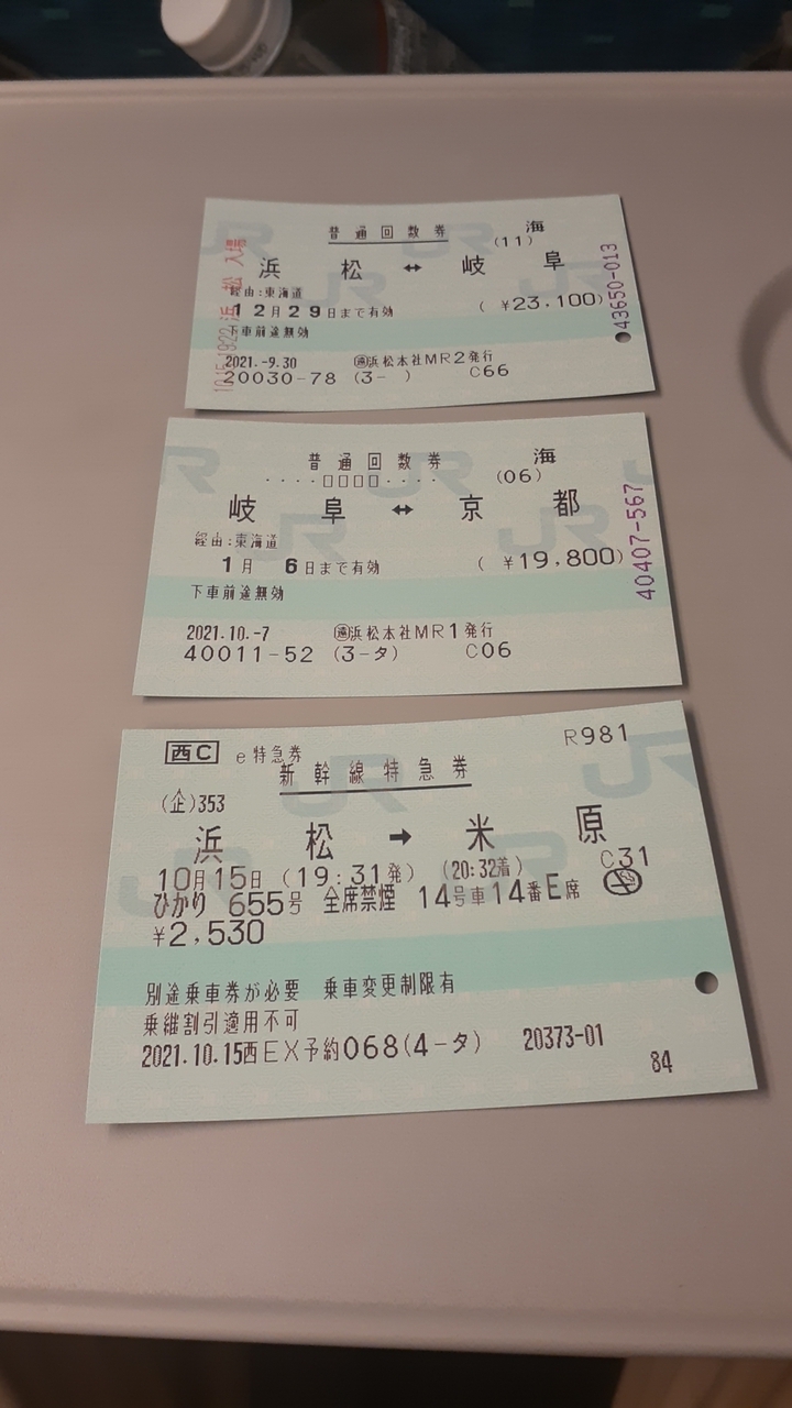 ちなみに切符は乗車券については浜松~岐阜間、岐阜~京都間の2枚を組み合わせたものを、特急券は浜松~米原間のものを利用しました。