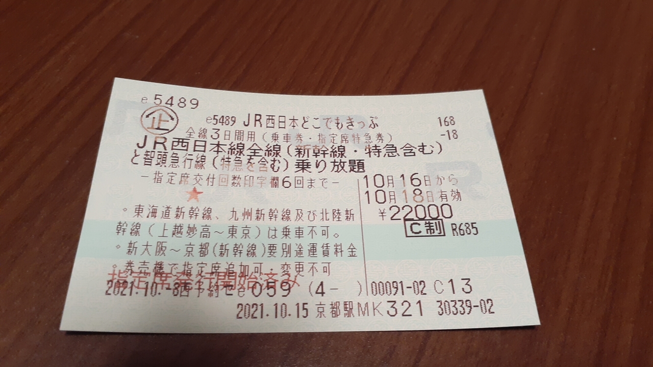 2021年10月16日から2021年10月18日にかけて22,000円で3日間利用し放題の切符を利用しましたが、新大阪~博多間を山陽新幹線で往復し、それだけでも得しましたが、さらに京都~糸魚川間を特急サンダーバードと北陸新幹線で往復利用することもでき、非常に満足しました。