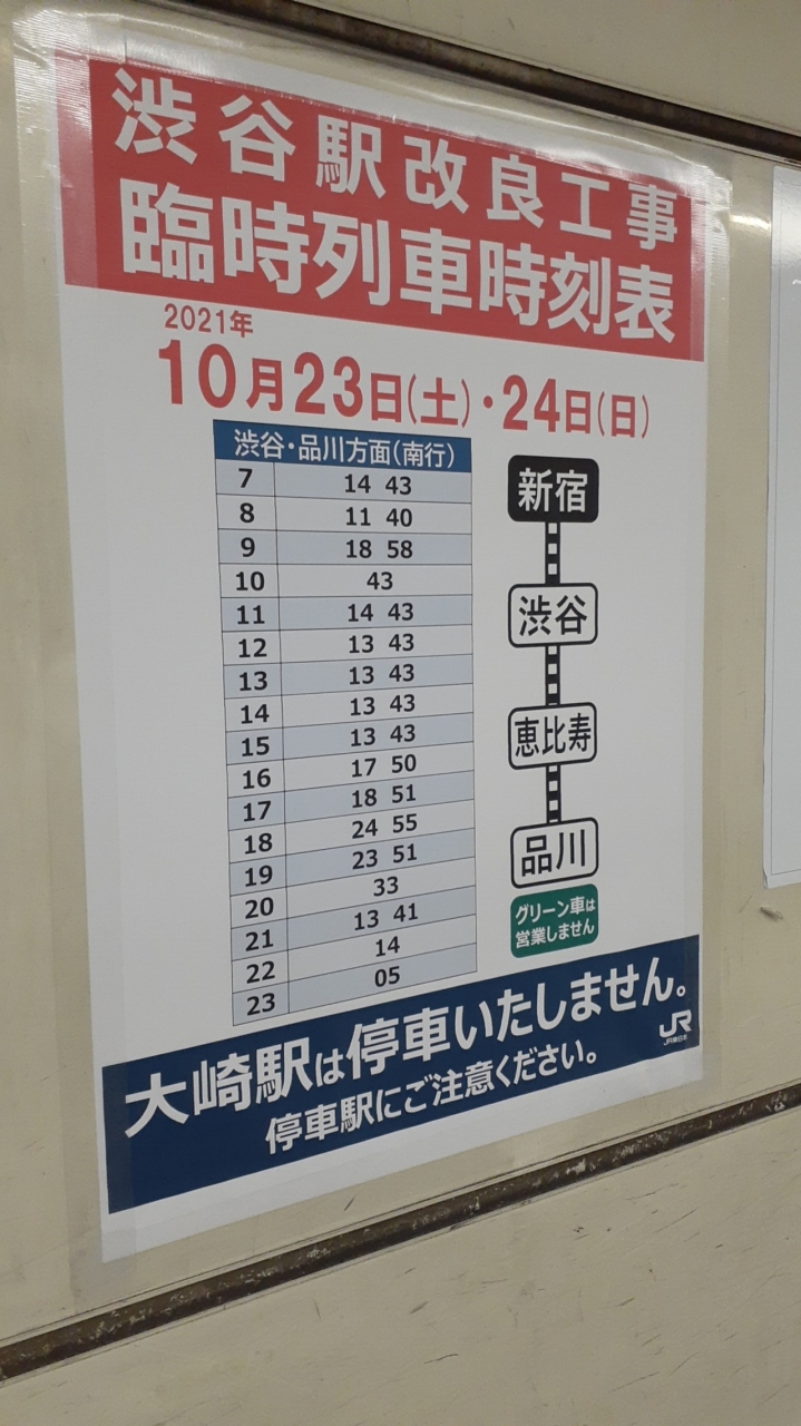 2021年10月24日現在、渋谷駅の改良工事に伴い山手線の大崎~池袋間が運休となっている為、新宿~品川間で臨時列車が運行されています。
