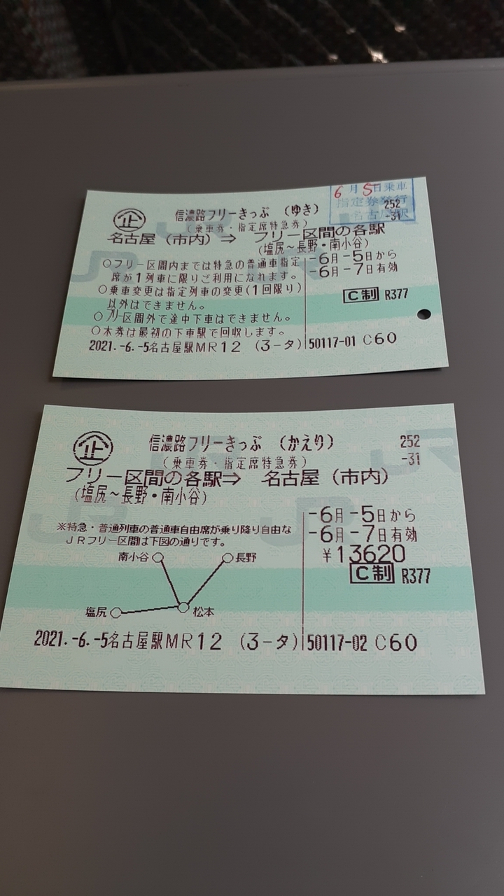 この切符、特急しなのの普通車指定席を利用して名古屋と塩尻~長野間を往復利用することができる上、①塩尻~長野間と大糸線のうち松本からは南小谷間の特急・快速・普通列車の自由席②指定されたエリアのアルピコ交通の路線バスが連続する3日間利用し放題となる為、大変便利でした。