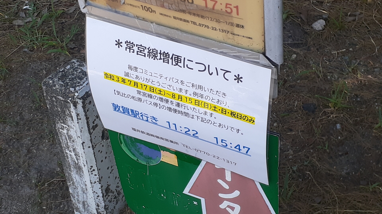 ただ2021年7月23日現在、バス停には2021年8月15日までの土日祝日に限り、敦賀駅発、立石発ともにそれぞれ2便、つまり2往復の増発を行う旨掲示がありました。