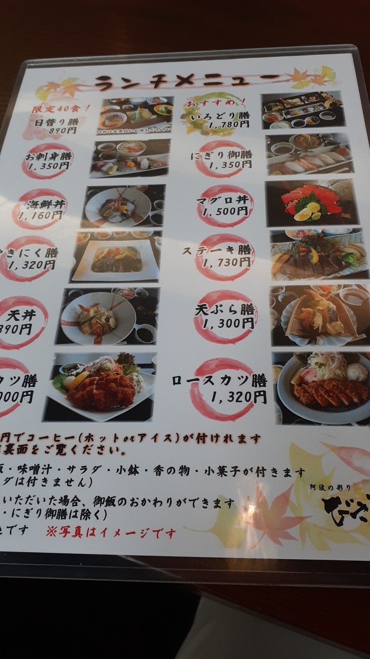 当日は550円する「刺身2点盛り」と1,280円する「阿波尾鶏の唐揚げ御膳」を頂きました。