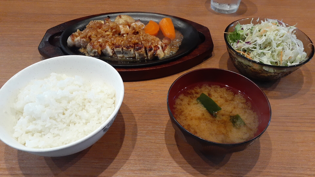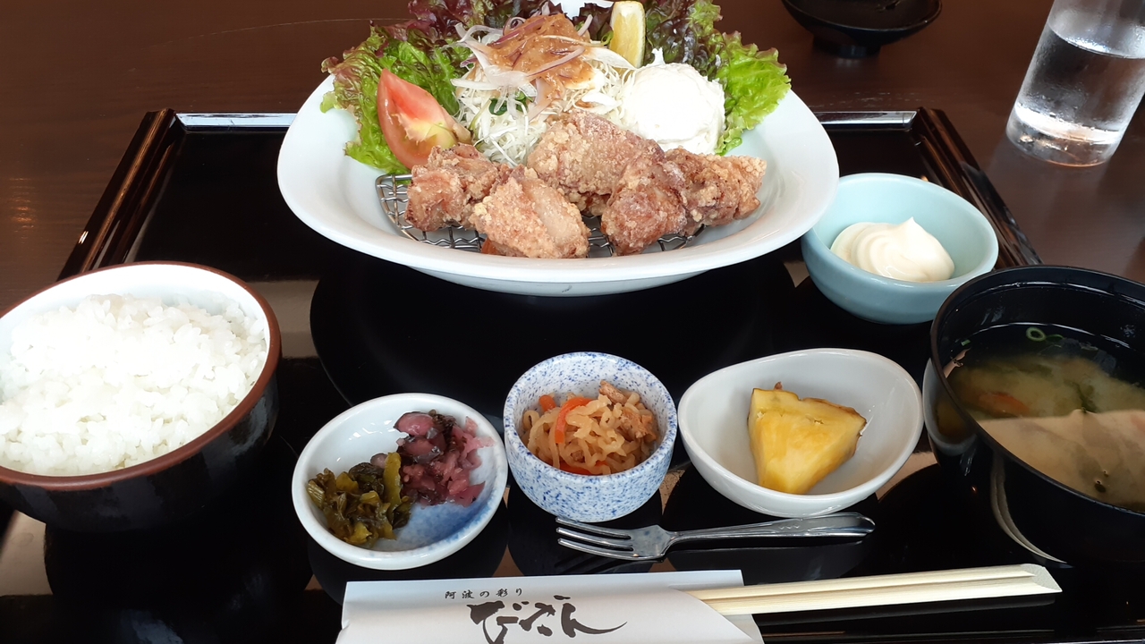 一方、阿波尾鶏の唐揚げ御膳は阿波尾鶏の唐揚げの他、ご飯・味噌汁・サラダ・小鉢(この日は切干大根)・お新香・フルーツが付いてきました。