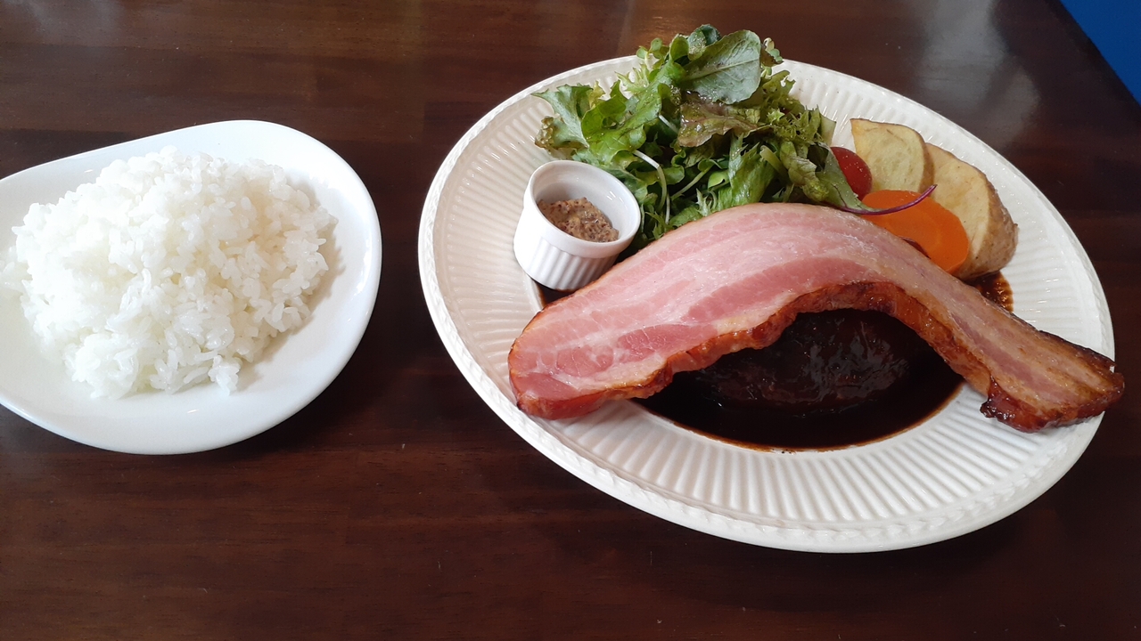 当日は厚切りベーコンのせハンバーグを頂きました。