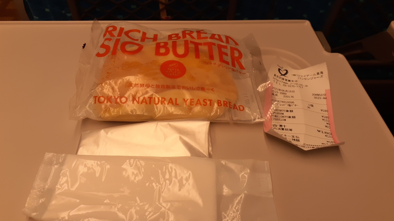 この塩バターパン、「デリカステーション」と称する東海道新幹線のホーム等にある売店でも発売しており、そのデリカステーションでは1個150円で購入できるのですが、車内販売では1個180円と、30円高いです。