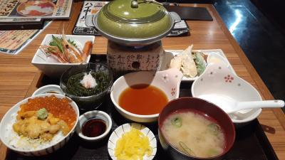 ちなみに当日は1食3300円する「甚平セット」を頂きましたが、中身はうに&いくらご飯・味噌汁の他、刺身(ぼたんえび・鮪等3種)、かに爪の天ぷら2本、北海陶板焼、昆布麺等が付いてきました。