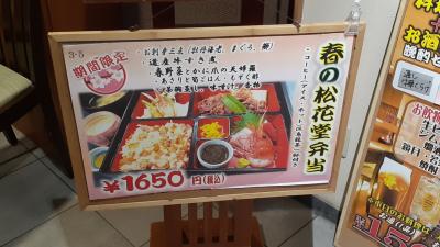 そのメニューですが、「春の松花堂弁当」で、入口前にある掲示によると、あさりと筍ご飯、道産牛のすき煮、刺身(ぼたんえび・鮪等3種)、春野菜とかに爪の天ぷら、茶碗蒸しが付いてくるそうで、さらに値段も1,650円と「甚平セット」の半分のお値段のようです。