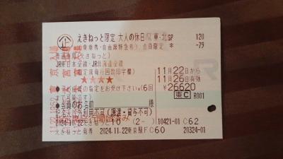 この切符、「大人の休日倶楽部」と称する年齢が満50歳以上の方で年会費を要する会員制の旅行サークルの会員に入会している方のみが購入できる切符で、2024年11月11日の木曜日から2024年12月10日の水曜日までの間、好みの連続する5日間26,620円でJR東日本・JR北海道エリアと一部の私鉄が利用し放題(乗り放題)となるというものです。