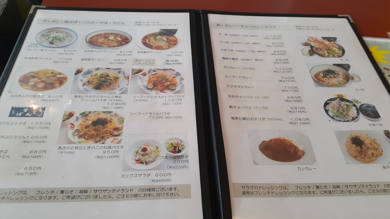 メニューですが、定食モノの他、丼モノ・カレー・ラーメン・そば・うどん等様々なジャンルの料理がありましたが、定食モノの場合、とんかつ定食・天ぷら定食・リブロースステーキセット・ビーフシチューセットの4種類程度しかなく、その点は不便さを感じるかもしれません。