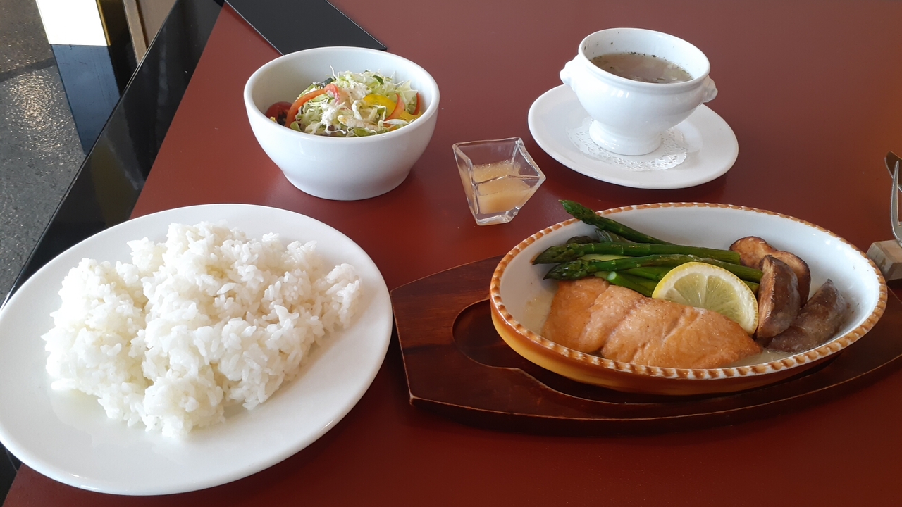 湧別産桜鱒のソテー・アスパラバター焼きの他、サラダ・ポテトフライ・ライス・スープが付き、値段は1,430円でした。