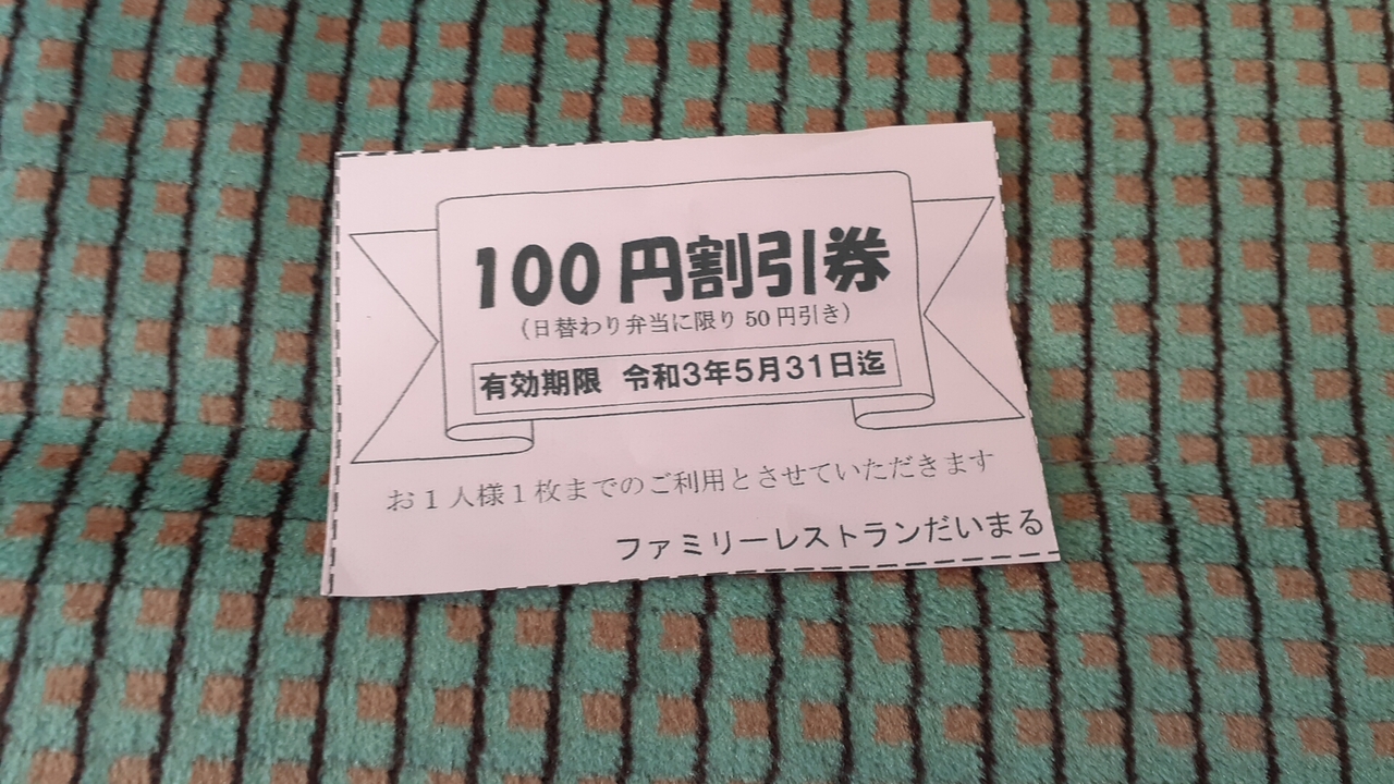 なお2021年5月6日現在、2021年5月31日まで利用可能となる100円の割引券を頂くことができました。