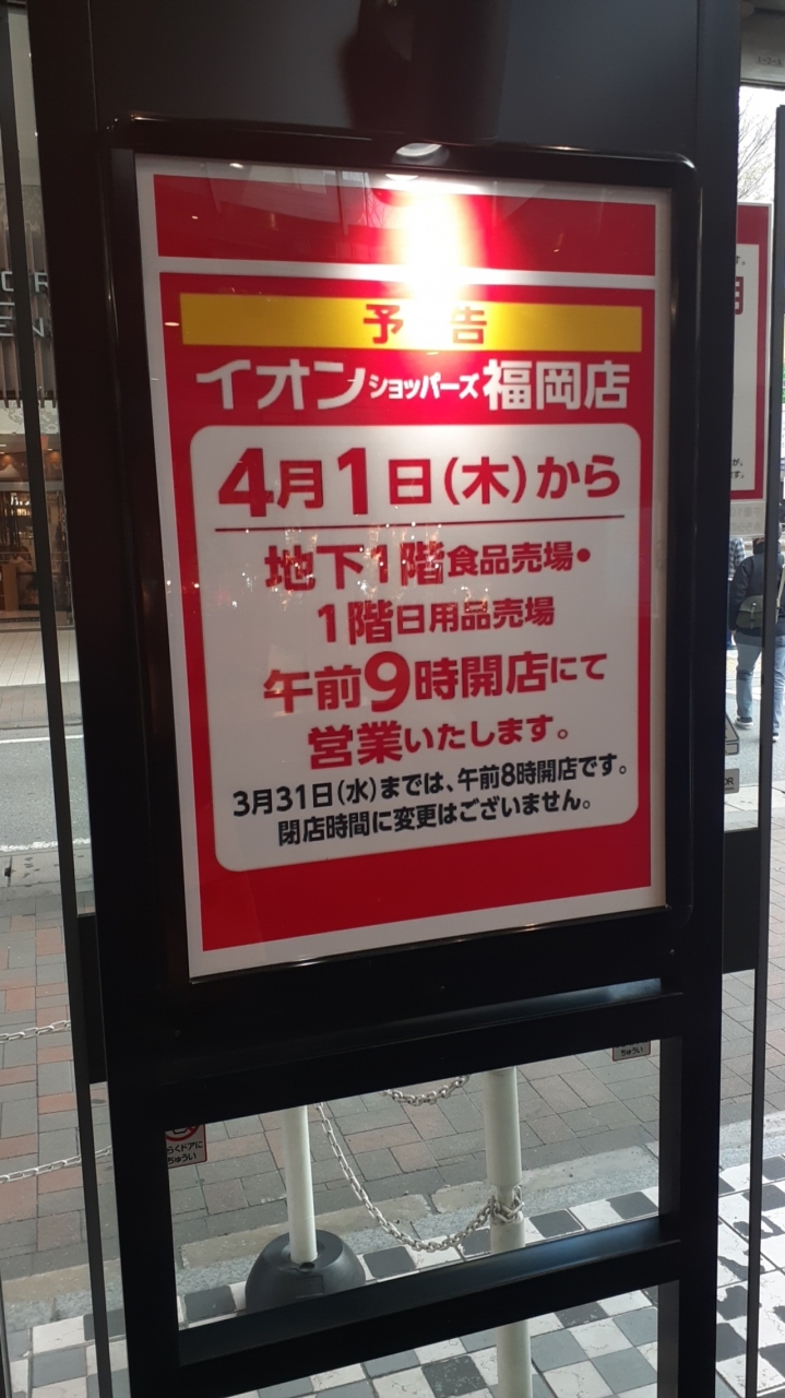 そのうち地下1階にあるイオンの食品売場ですが、2021年3月14日現在、2021年4月1日より開店時刻を朝8時から9時に1時間遅くする旨の掲示がありました。