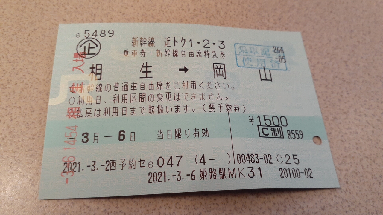 参考までに2021年3月6日に相生~岡山間の切符を利用しましたが、1,500円で利用することができ、運賃プラス330円で新幹線が利用できるという感じでした。