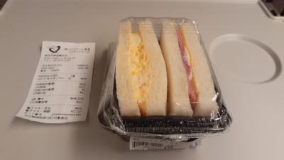 参考までに車内販売で取扱いしているのは600円するミックスサンド、カツサンド、ハムたまごサンドとのことで、当日はハムたまごサンドを購入しました。- 旅行時期