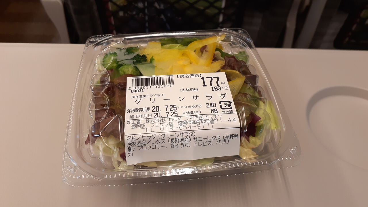 2020年7月25日に利用し、当日は163円する「グリーンサラダ」と1食500円する「県産牛焼肉弁当」を頂きました。