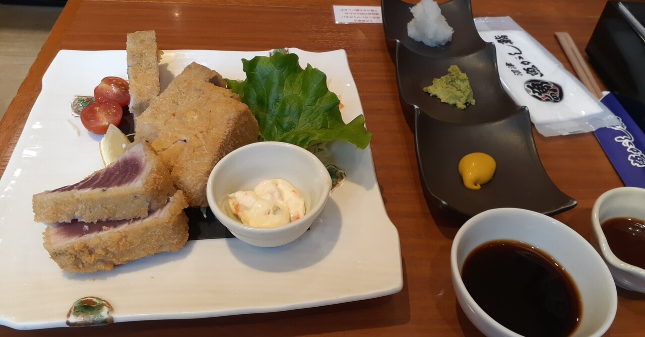 そのうちまず「まぐろのレアカツ」ですが、まぐろのレアカツが6切れ盛られ、添え合わせとしてキャベツの千切り・プチトマトが、さらに薬味として大根おろし等が付いていました。
