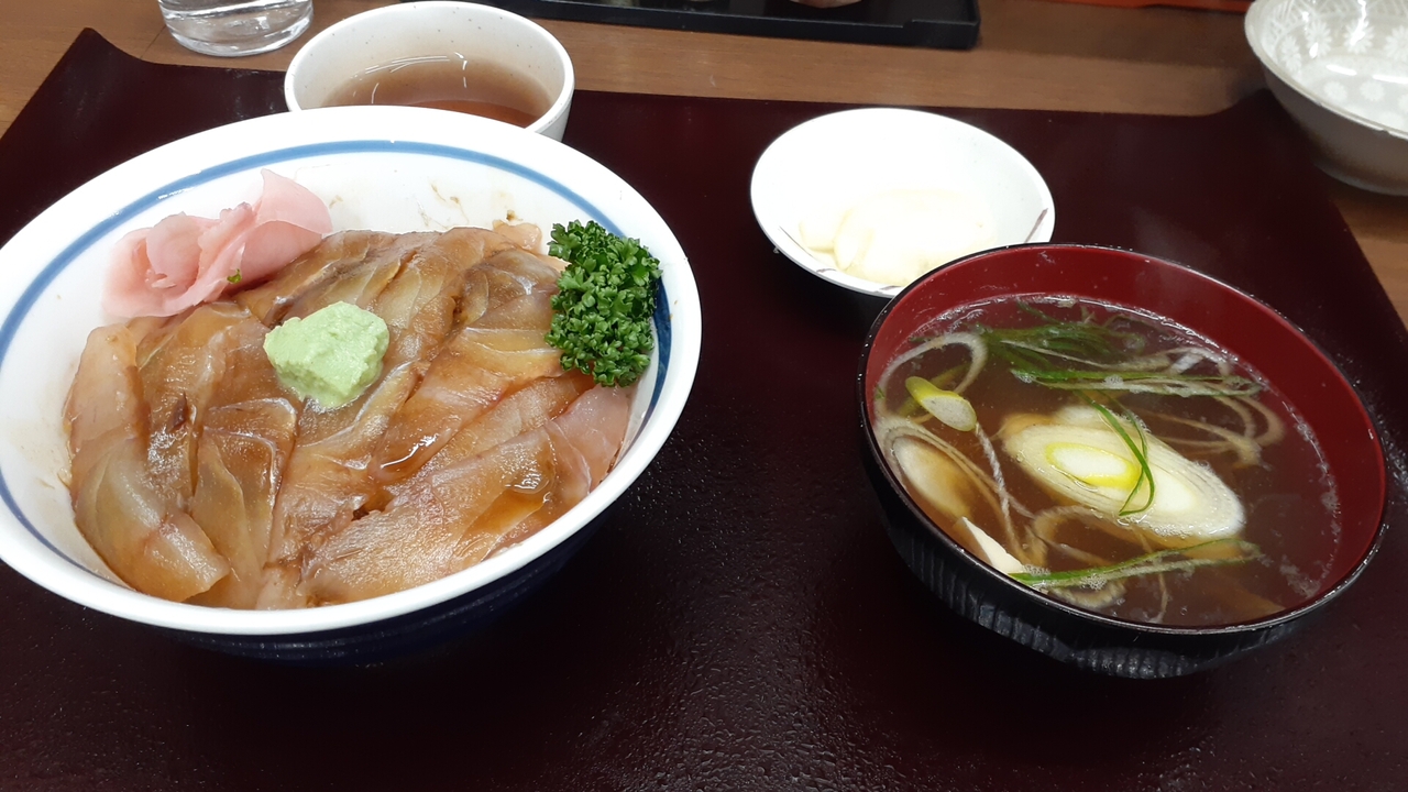 続いて「ヒラメの漬け丼」ですが、ご飯の上にヒラメの切身(味付け)が多数盛られ、味付けもくどくなく