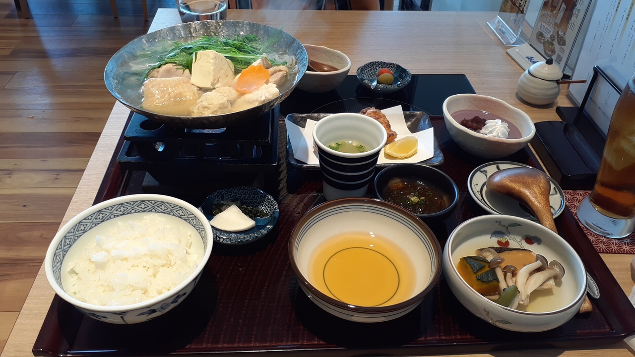 水炊き小鍋の他、唐揚げ・小鉢(この日は鮭と野菜の煮物)・スープ・ご飯・デザートが付いてきました。