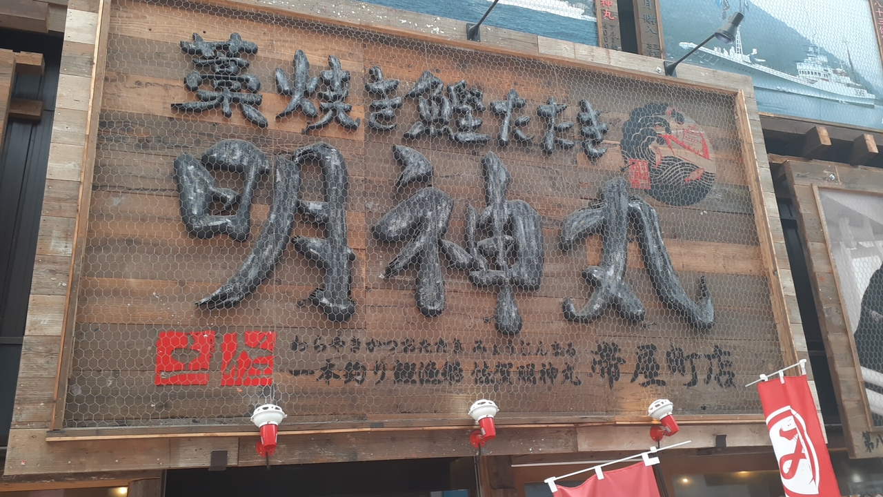 高知市内に本拠地を持つ明神丸という会社が運営するかつおのたたきをメインとする飲食店の1つで、帯屋町店はJR高知駅から南西方向に徒歩15分強のところにあります。