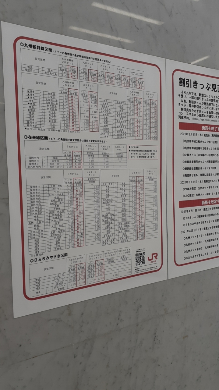 ただこの切符、2021年3月末で発売を終了するそうで、また他の割引切符も価格を見直す(値上げする)そうで、2021年4月以降、博多~鹿児島中央間の最安値は8,500円、博多~熊本間でも3,200円と従来と比べ結構高くなり、かなりの負担増となる点で不便になると思われます。