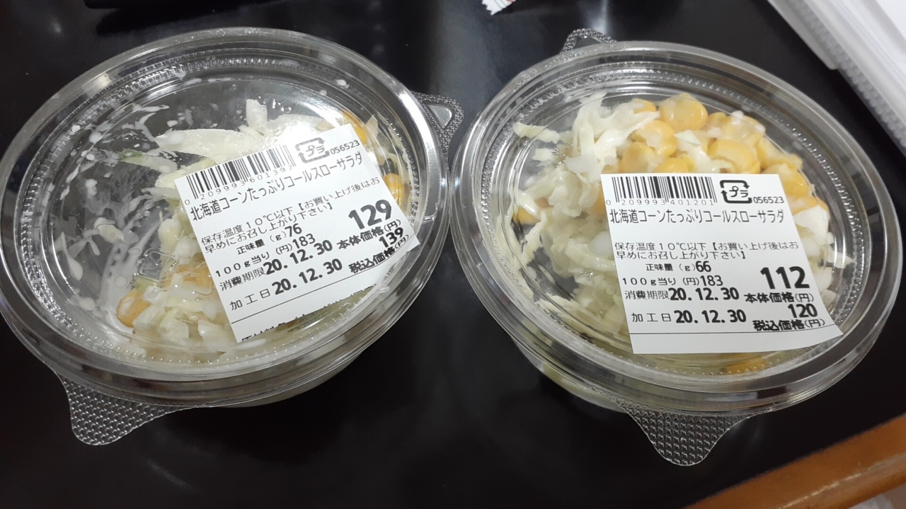 2020年12月30日の19時前に訪れ、当日は「北海道産コーンたっぷりコールスローサラダ」を購入しました。