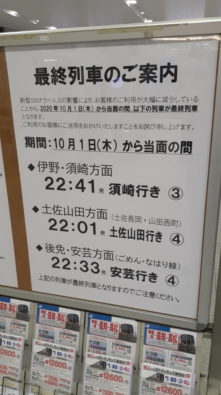 2020年12月29日現在、高知駅から各方面への最終列車が所定より早くなっているそうで、駅の掲示によると土佐山田方面は22時01分発土佐山田行き(23時10分発土佐山田行きは運休)、伊野・須崎方面は22時41分発須崎行き(23時10分発伊野行きは運休)になるとのことでした。