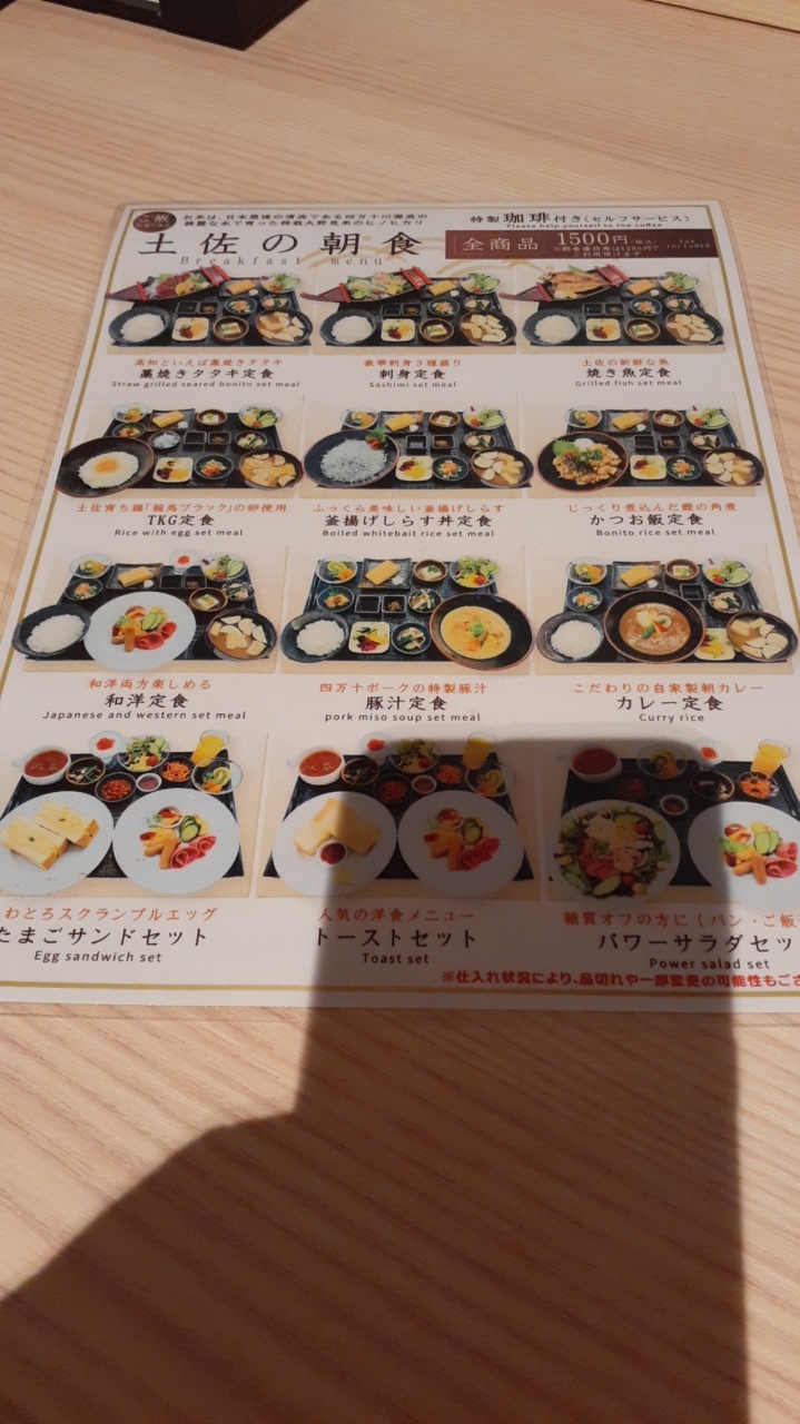 朝食は別料金で、刺身定食・鰹のたたき定食等メニューは豊富ですが、値段は1,500円とこちらもかなり強気の値段でした。